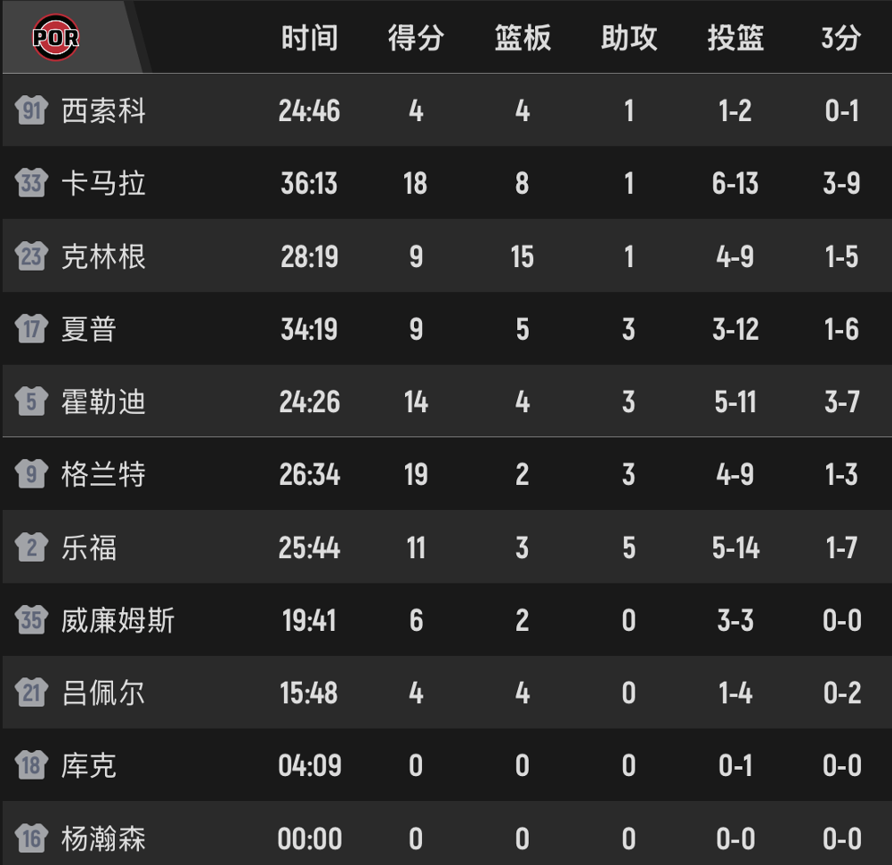 夏普、乐福的投篮效率均为7中1,斯普利特就是不给杨瀚森机会,吕佩尔都打了7分多钟,小杨枯坐板凳。第三节开拓者一度落后20分,之后开拓者不断在篮下造犯规,卡马拉命中2记关键三分,当乐福在反击中上篮命中,开拓者追至56-66,打停凯尔特人。布朗造成杀伤罚球2进1,夏普拉杆上篮打板命中,差9分了。凯尔特人的谢尔曼补篮得手,格兰特上罚球线2罚都进。